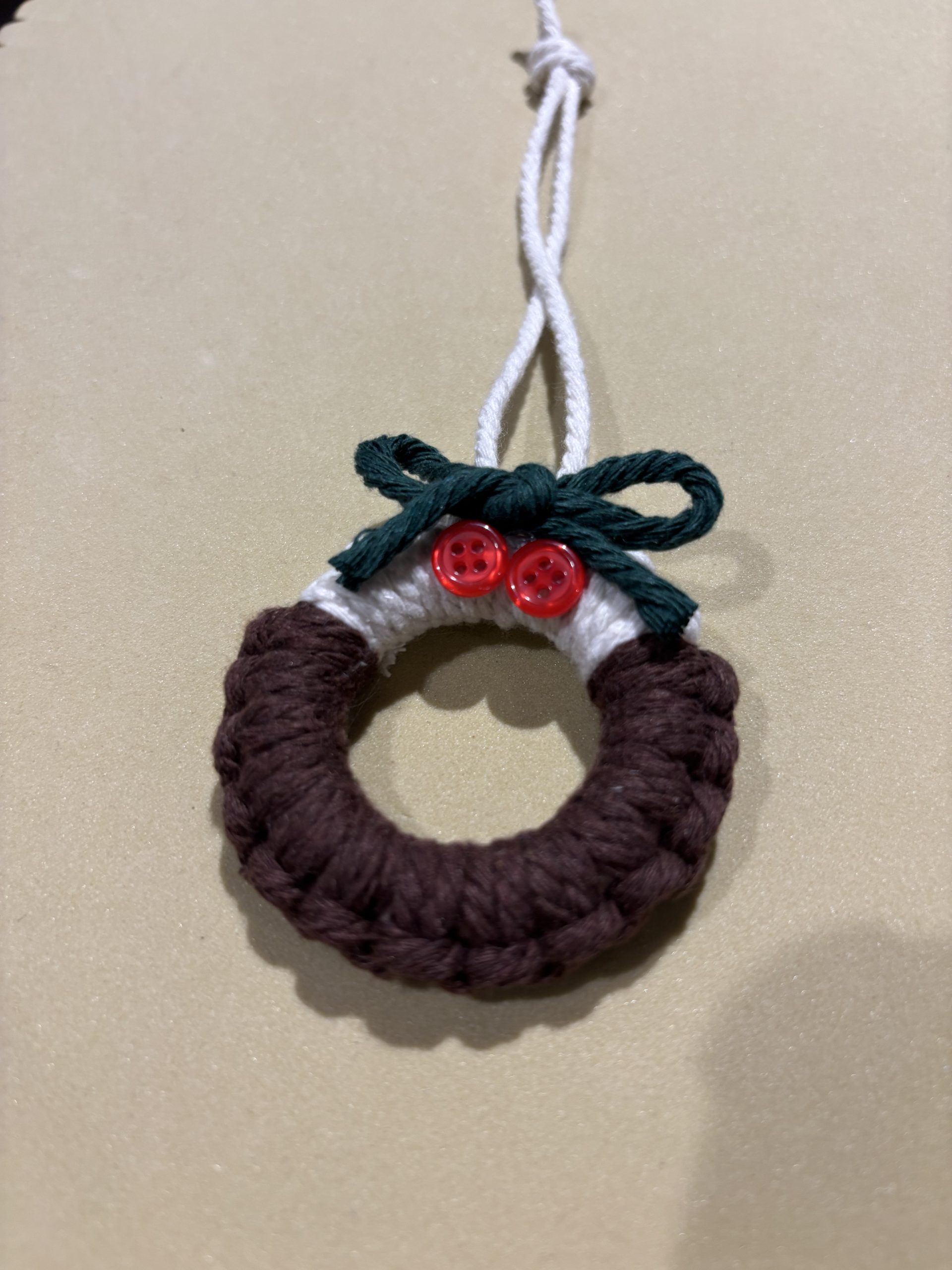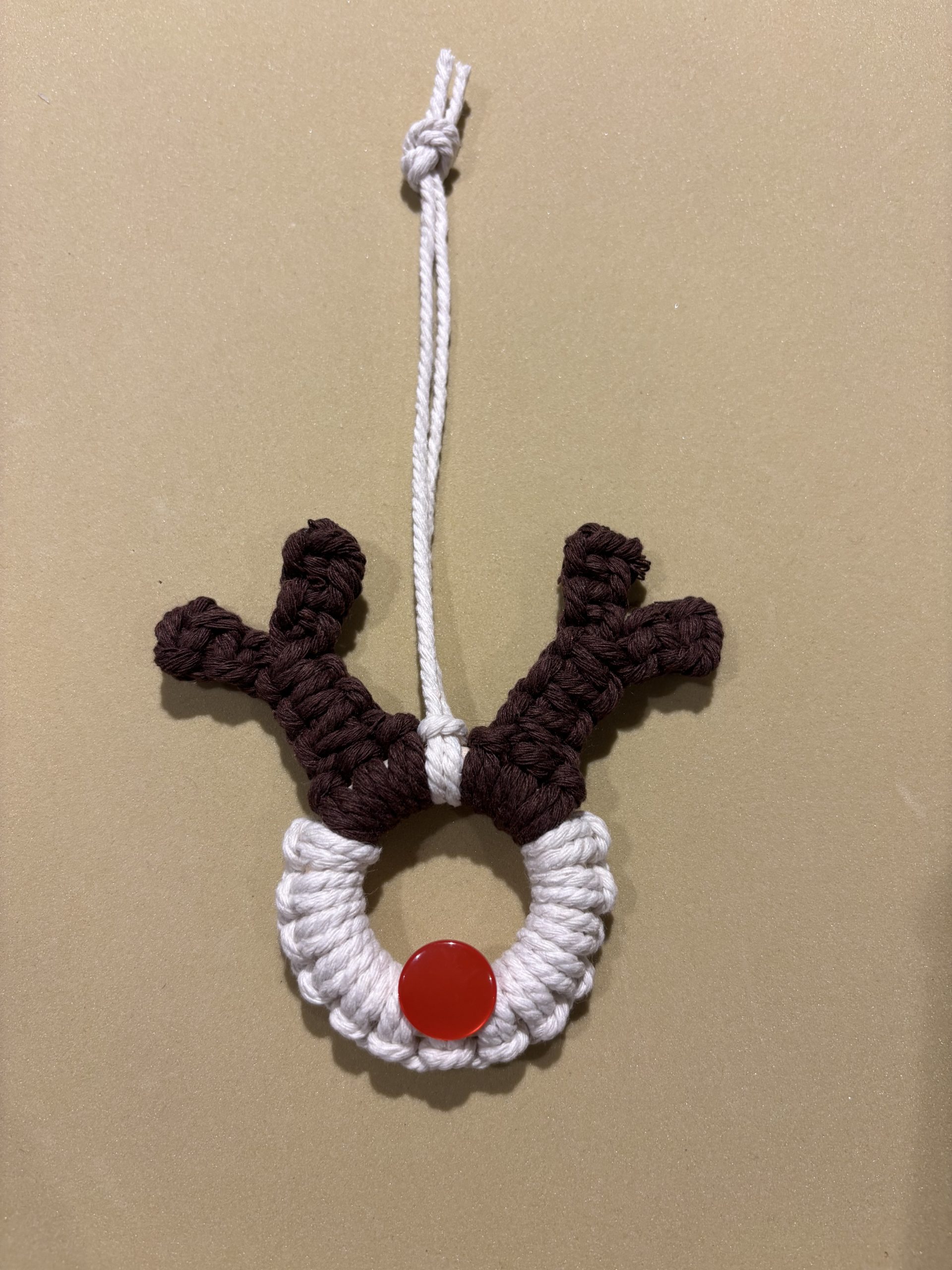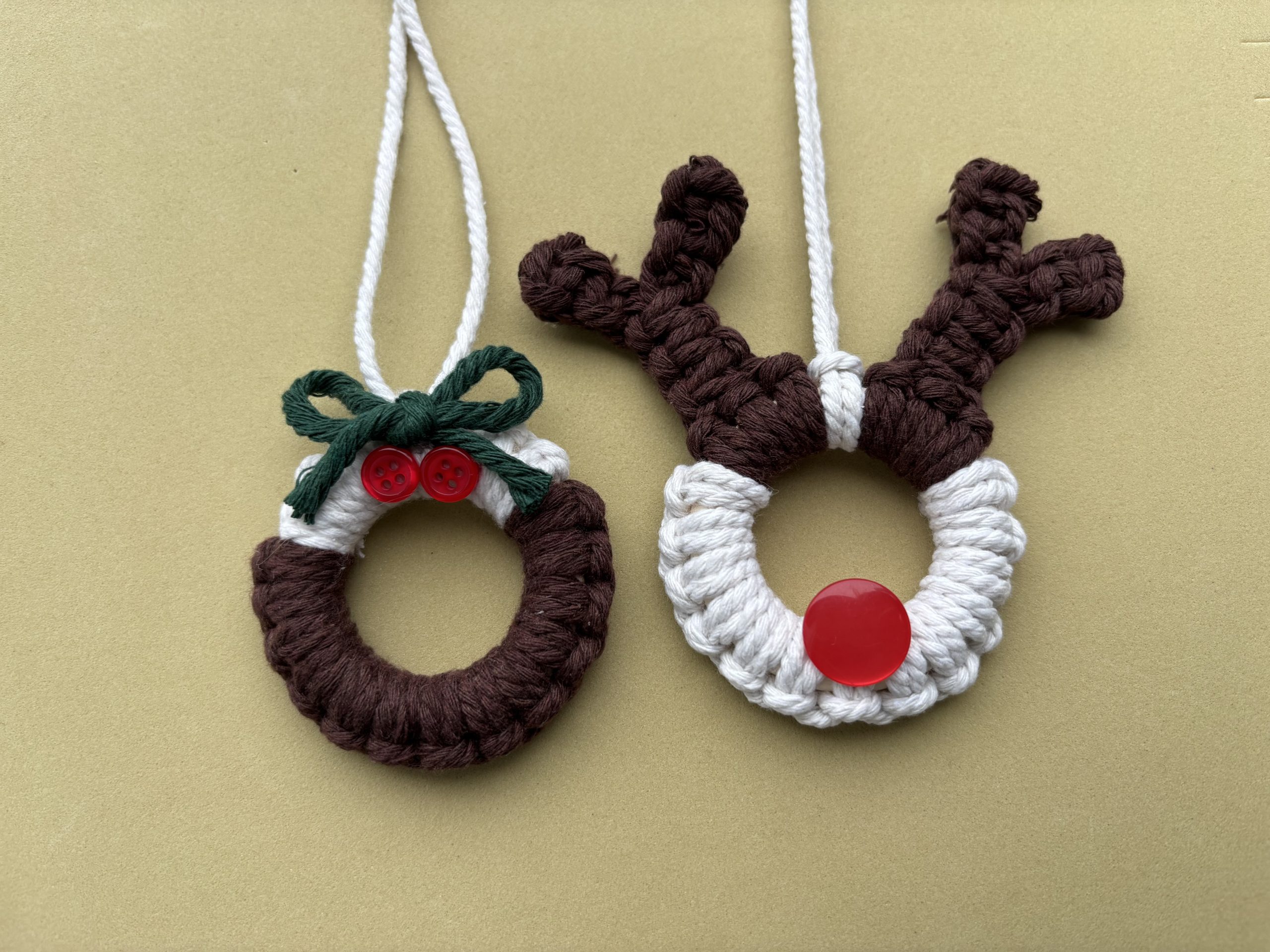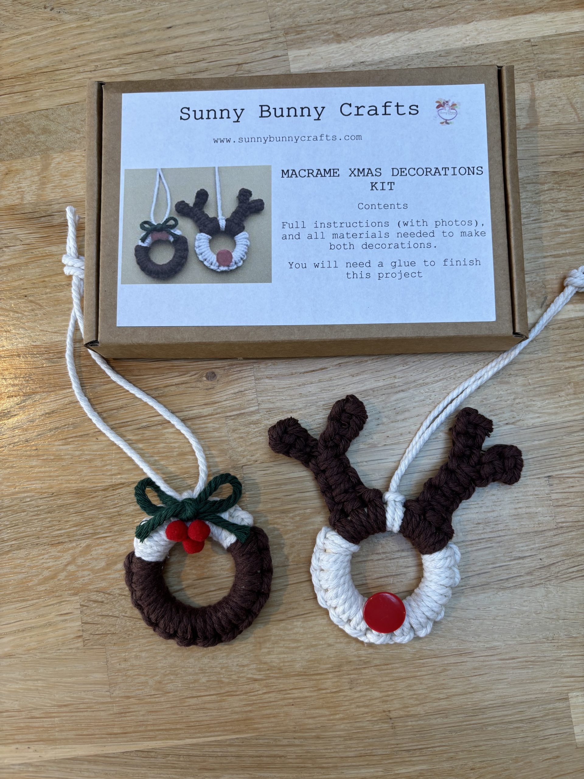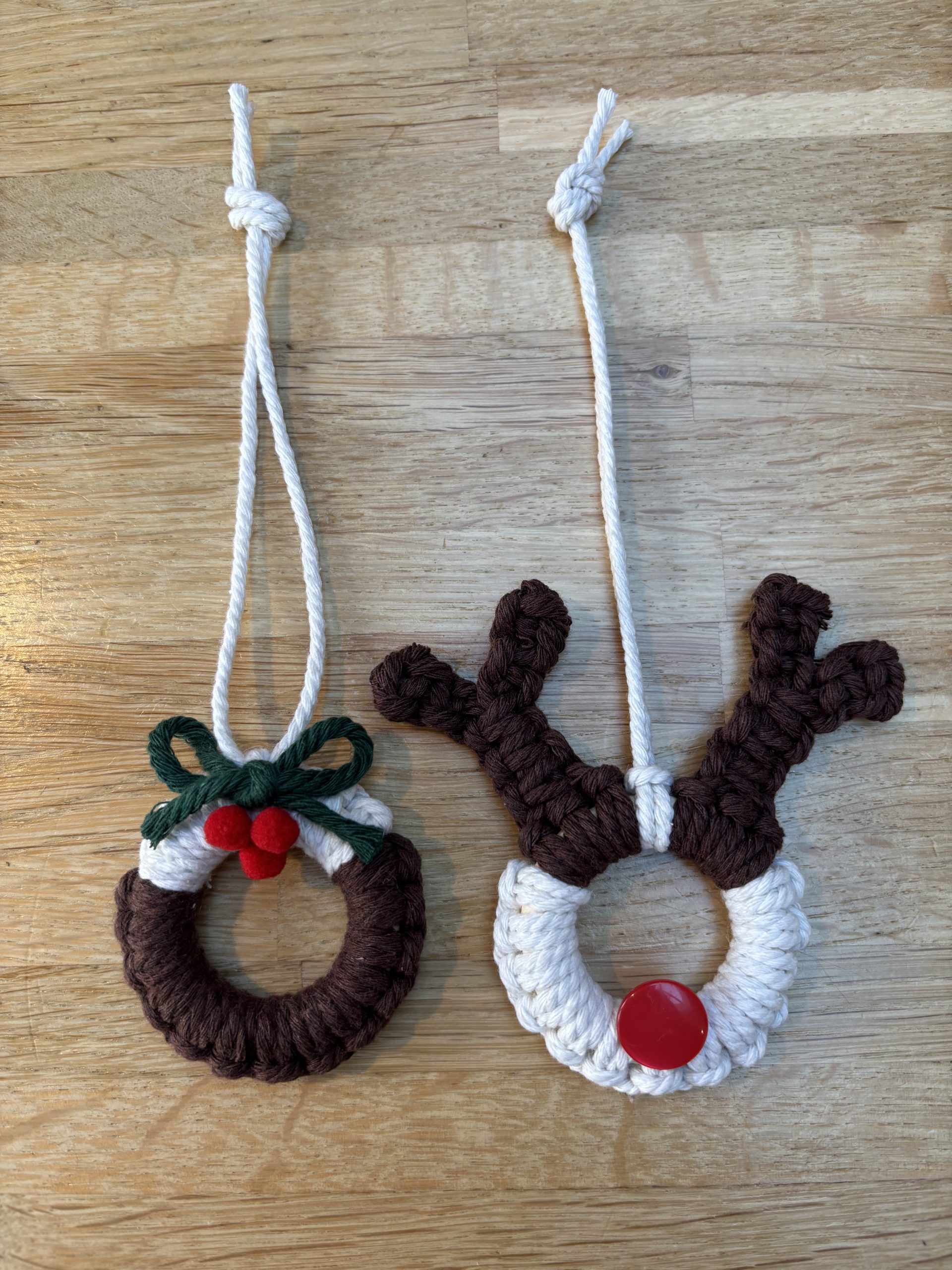 This is a kit to make two Xmas macrame decorations – a reindeer and a Xmas pudding. Great for adding to the tree or giving as a gift.
