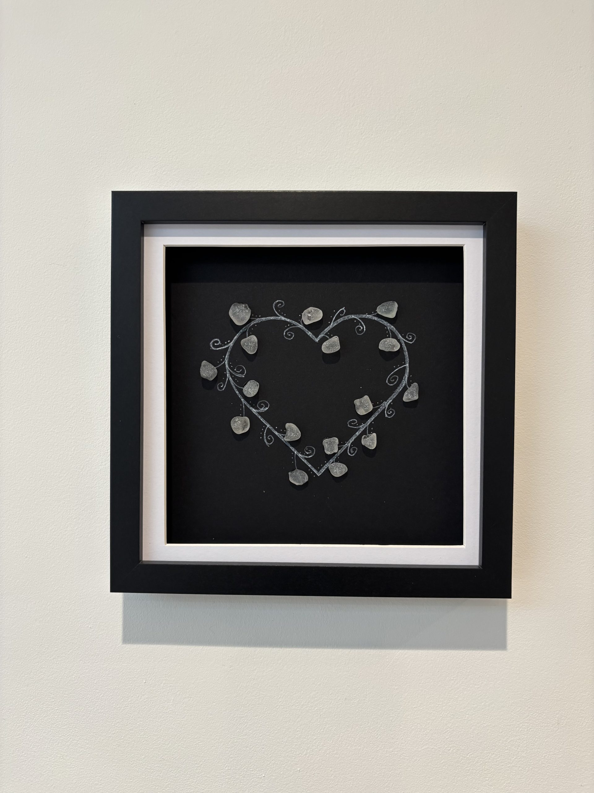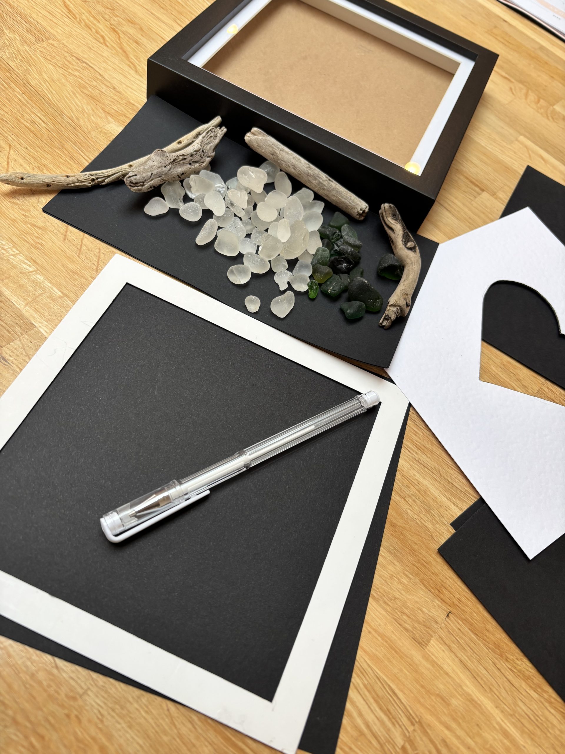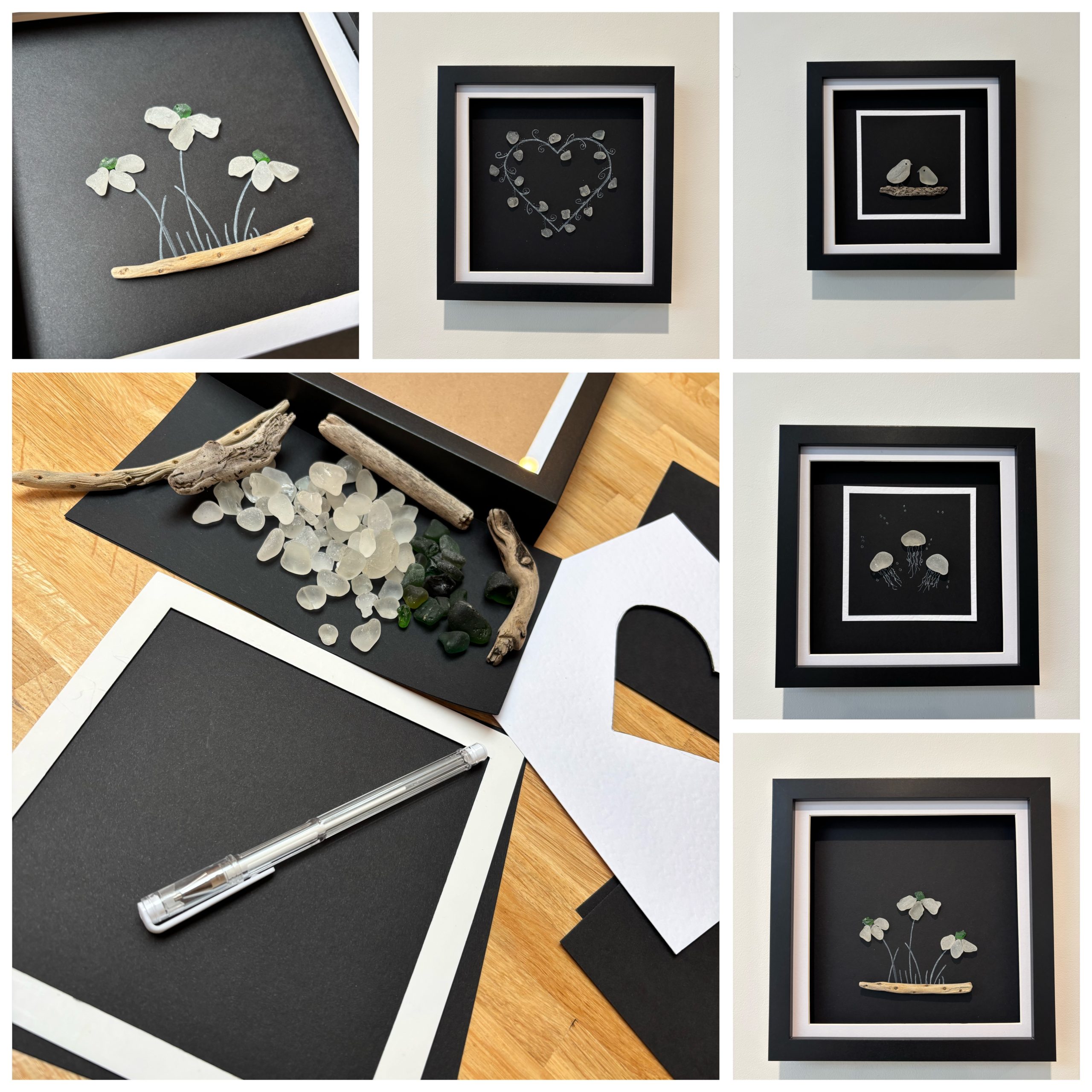 New – our seaglass art workshop but with a twist – we will be using a black frame and black and white card to make a stunning black and white (with a little bit of green) picture.