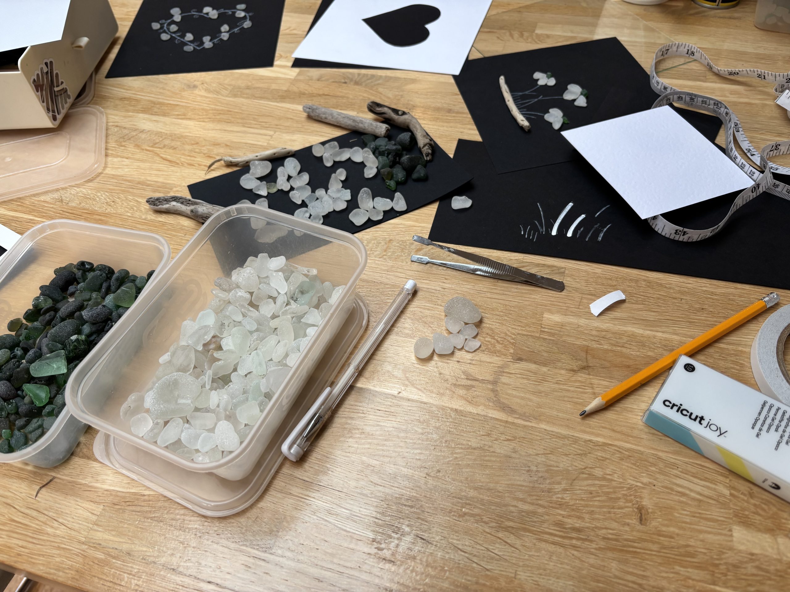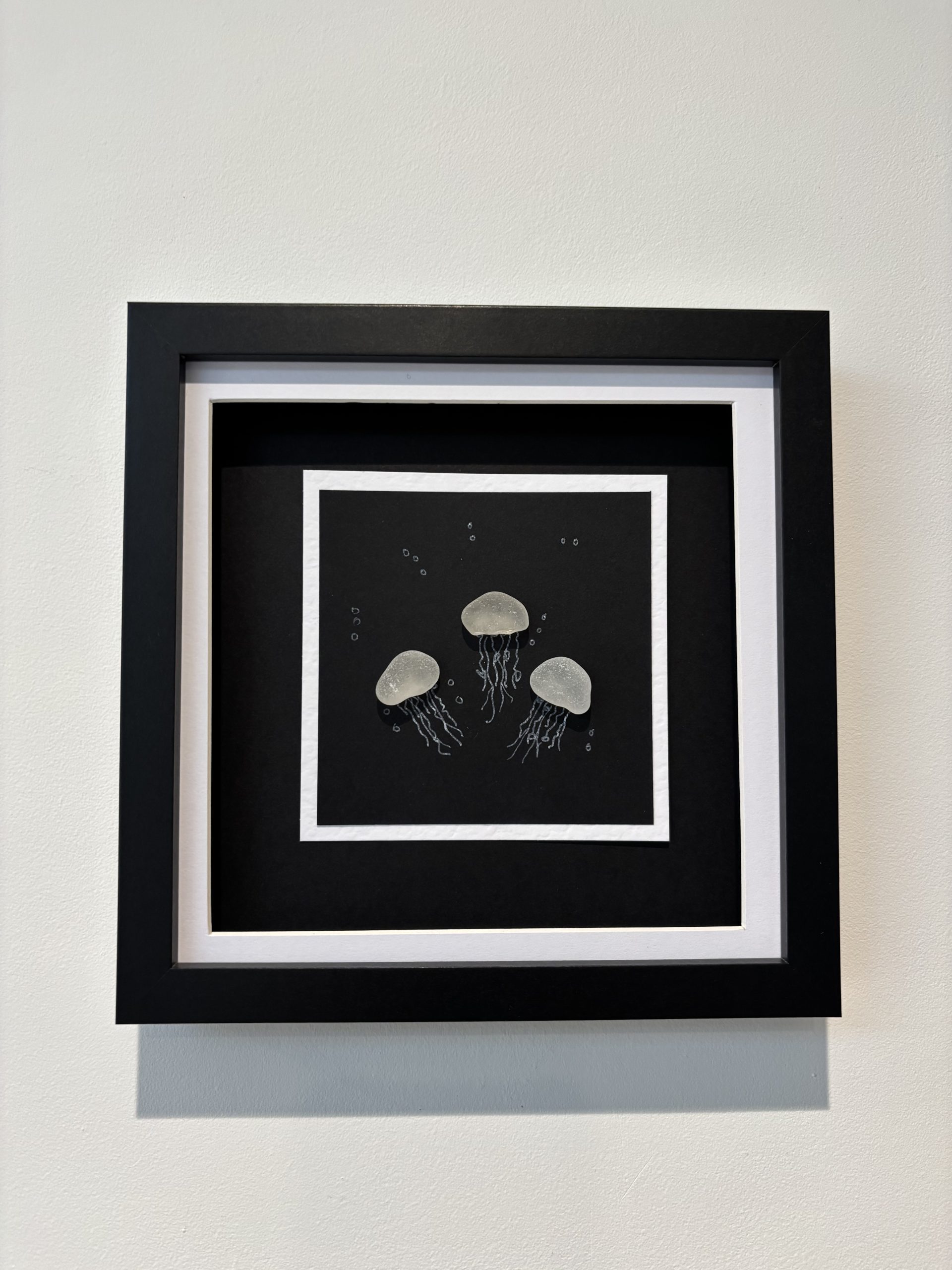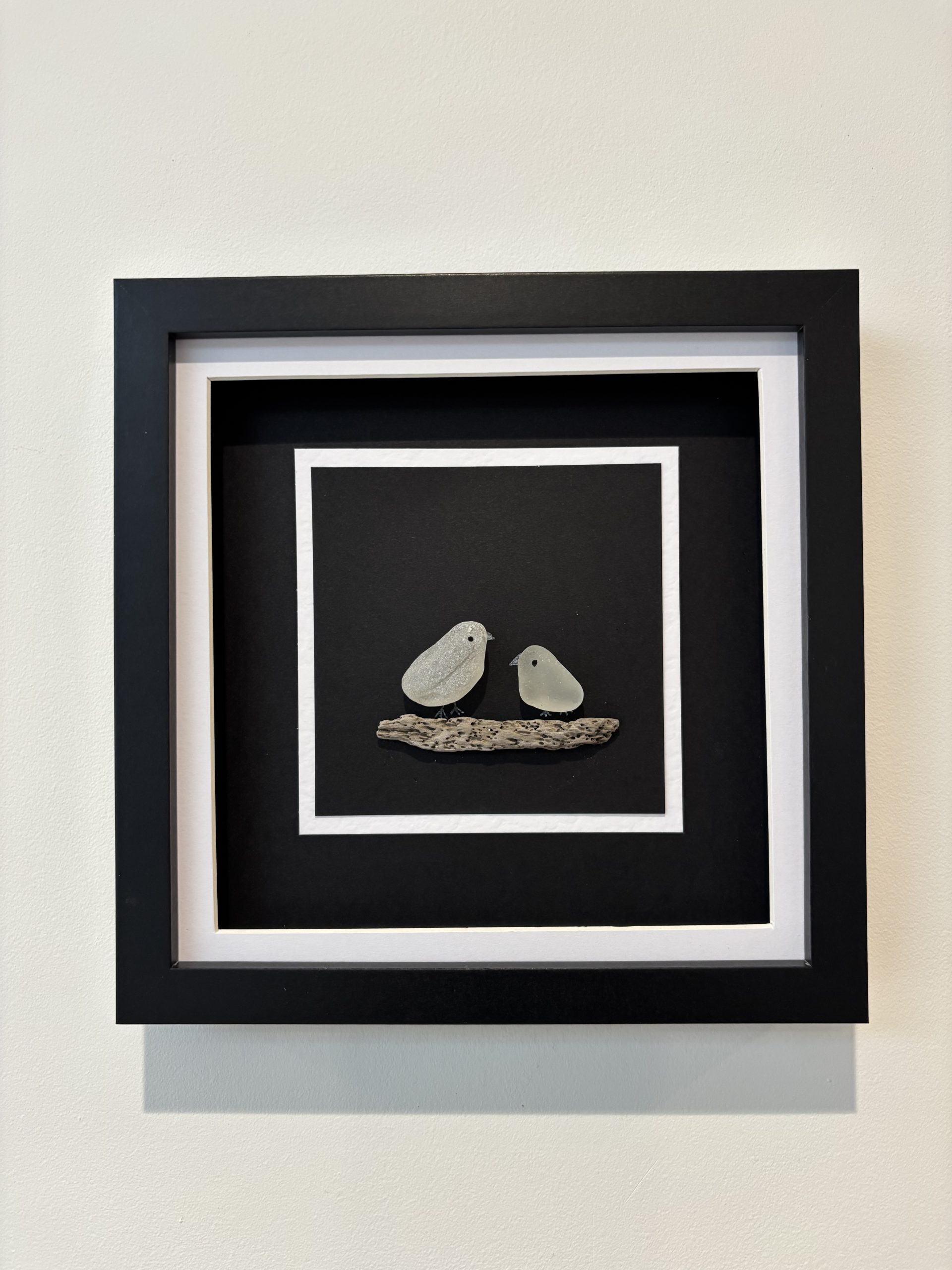 New – our seaglass art workshop but with a twist – we will be using a black frame and black and white card to make a stunning black and white (with a little bit of green) picture.